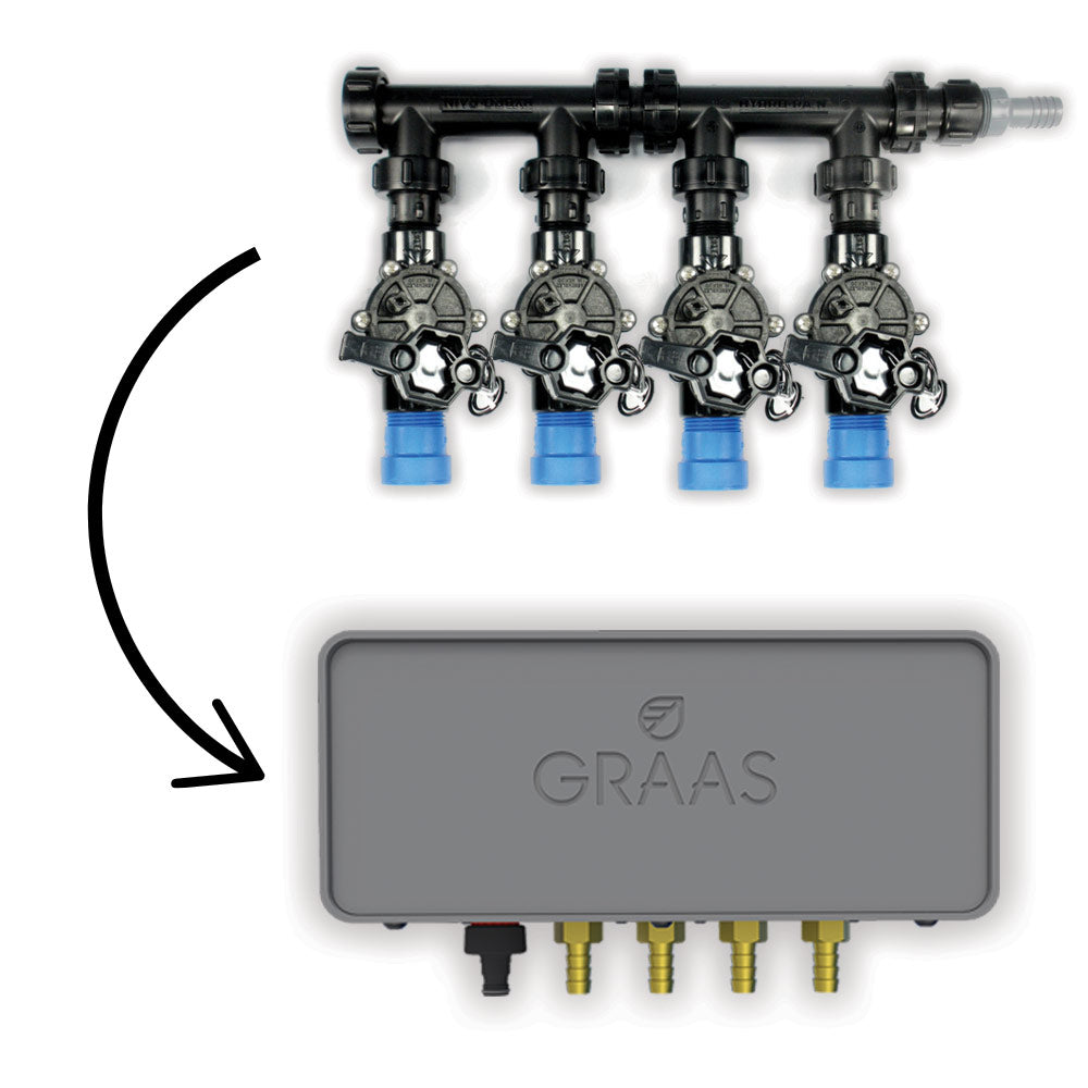 Su GRAAS iRigator galima laistyti šiltnamį ir daržą. Laistymo valdiklis turi būti montuojamas šiltnamyje. Tuomet iš šiltnamio galite papildomai išvesti žarnas daržo laistymui.