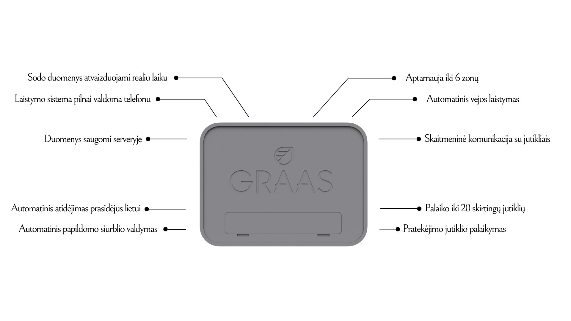 GRAAS LawnCare valdiklis yra kabinamas viduje, sausoje vietoje.