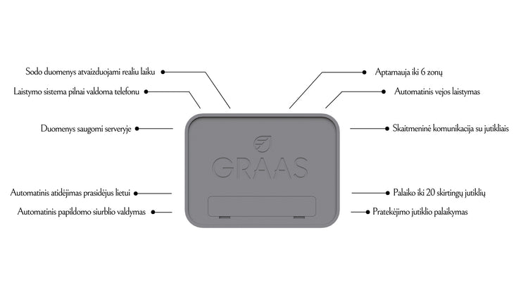 • GRAAS LawnCare automatinė vejos laistymo sistema • Maitinimo blokelis • Laidų apsauga |